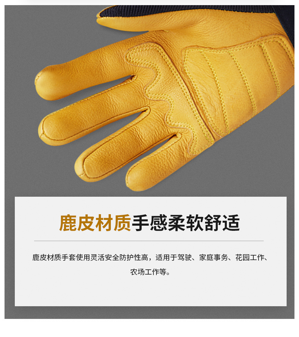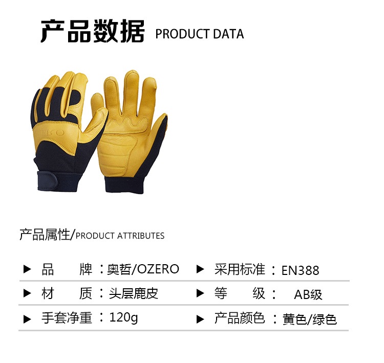 颜 色 : 黄色/绿色 规 格 : S、M、L、XL、XXL 材 料 : 鹿皮+楼梯布 特 性 : 柔软舒适、透气灵活、防滑耐磨等 适 用 场 景 : 骑摩托车、骑马、驾驶、园艺工作、机械搬运、伐木采石等