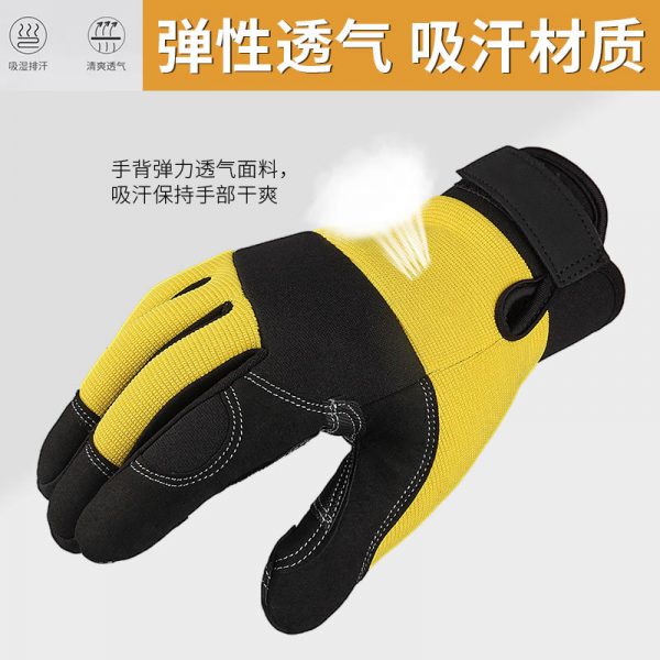 颜 色 : 黑色/黄色 规 格 : M、L、XL 材 料 : 手掌黑色仿超纤,手背三合一楼梯布,袖口潜水料,掌 托+掌指PVC止滑皮,傍条健康布,TPR魔术贴 特 性 : 触屏、透气、耐磨、防撞击等 适 用 场 景 : 驾驶、攀岩、骑马、骑自行车、骑摩托车